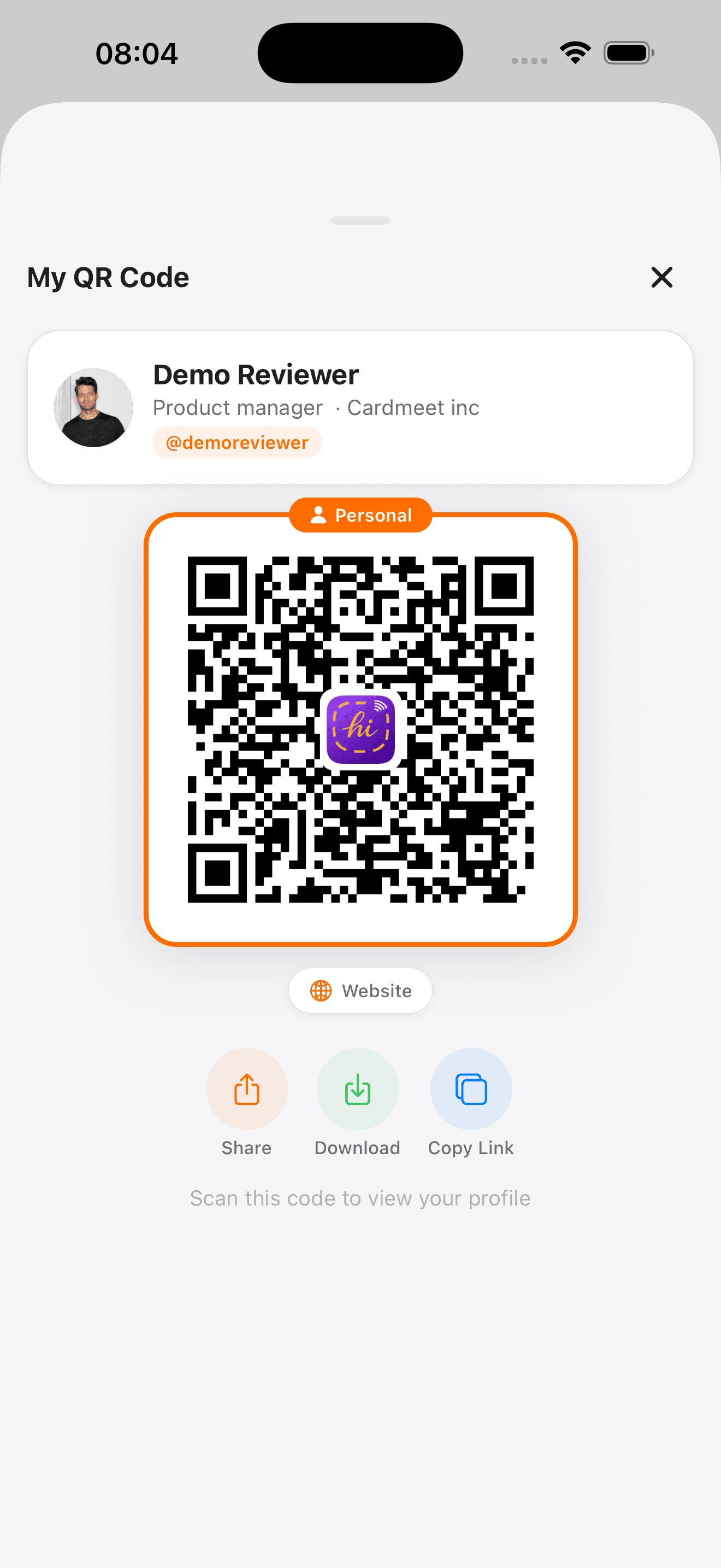 One tap to share your card via QR code, link, or NFC. No app needed to receive.